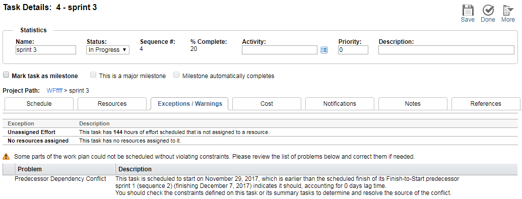 Warnings identify structural problems or inconsistencies in the work plan when you schedule the work plan or saved changes to work plan schedule information. PPM only issues warnings based on the schedule warning rules that have been selected in the project Scheduling policy.