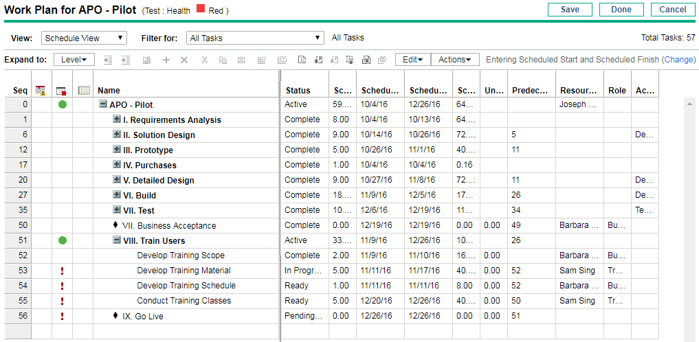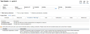 From the Project Exception Details page, you can click a task link to locate the task in the work plan Schedule View to check the task details.
