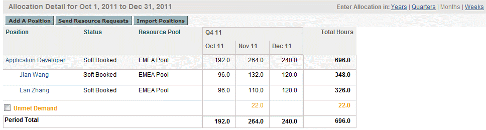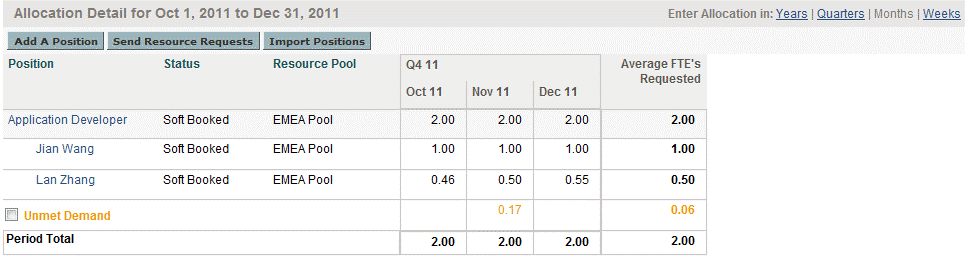 The position is using different calendars from the assigned resource. In this case, position related resource pool is using EMEA calendar that has six working hours per day and 16 working days in October while resource Lan is using China calendar that has ten working hours per day and 21 working days in October. This means working hours in one FTE on the position may differ form working hours in one FTE on the assigned resource. In this example, one FTE on the Application Developer only requires Lan 0.46 FTE to fulfill it. That is why the forecast demands is 2.00 FTEs and the assignment is 1.46 FTEs, but the unmet demand is 0.00 FTE.