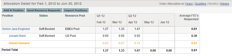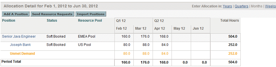 In the following example, Project D requires senior java engineers for three months from February through April from US Pool.