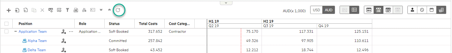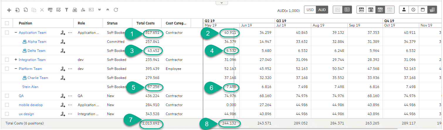 2 Forecast costs of the position demand by month, quarter, or year, depending on the display view 3 Forecast costs of the team assignment for the whole period 4 Forecast costs of the team assignment by month, quarter, or year, depending on the display view 5 Forecast costs of the resource assignment for the whole period 6 Forecast costs of the resource assignment by month, quarter, or year, depending on the display view 7 Forecasts costs of all the position demand for the whole period