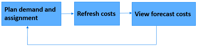 Normally, you view forecast costs after you plan resource demand and assignment and wait for or manually trigger the background service to calculate the costs, as illustrated in the process below.