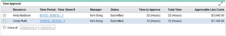 - Select the check boxes of the time sheets to approve or reject. Select Check all if you want to approve or reject all the listed time sheets.
