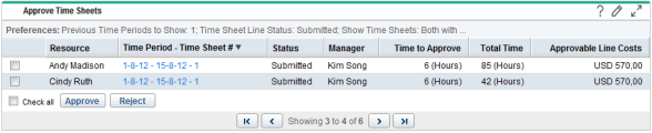 If you approve or reject a time sheet in the list without opening it, you actually approve or reject only the time sheet lines that you are authorized to approve or reject.