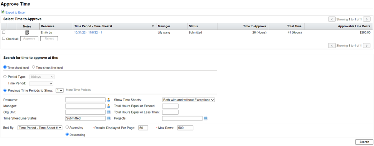 To search for time sheets to approve or reject, click Time sheet level.