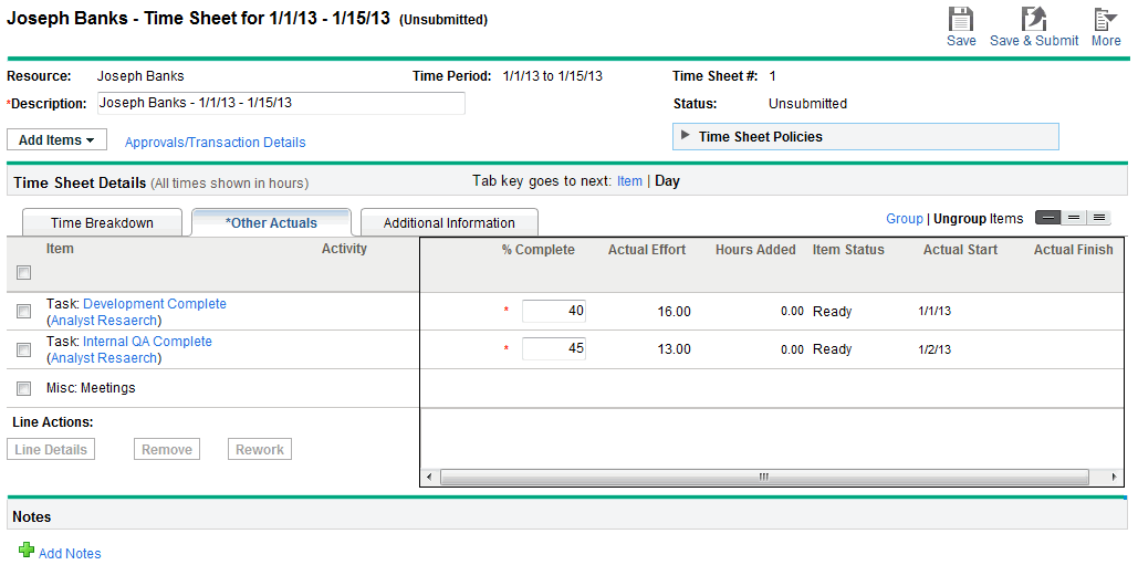 Enter or view other actual data in time sheets