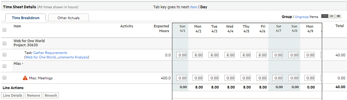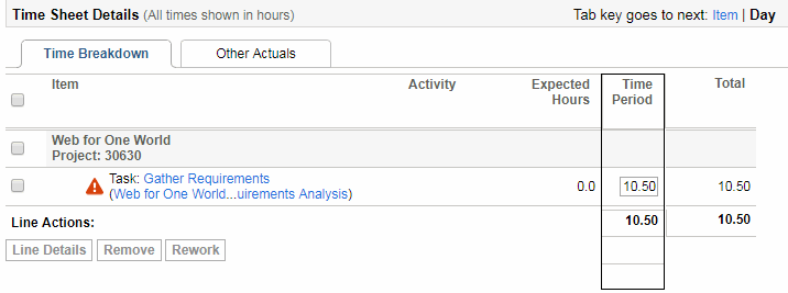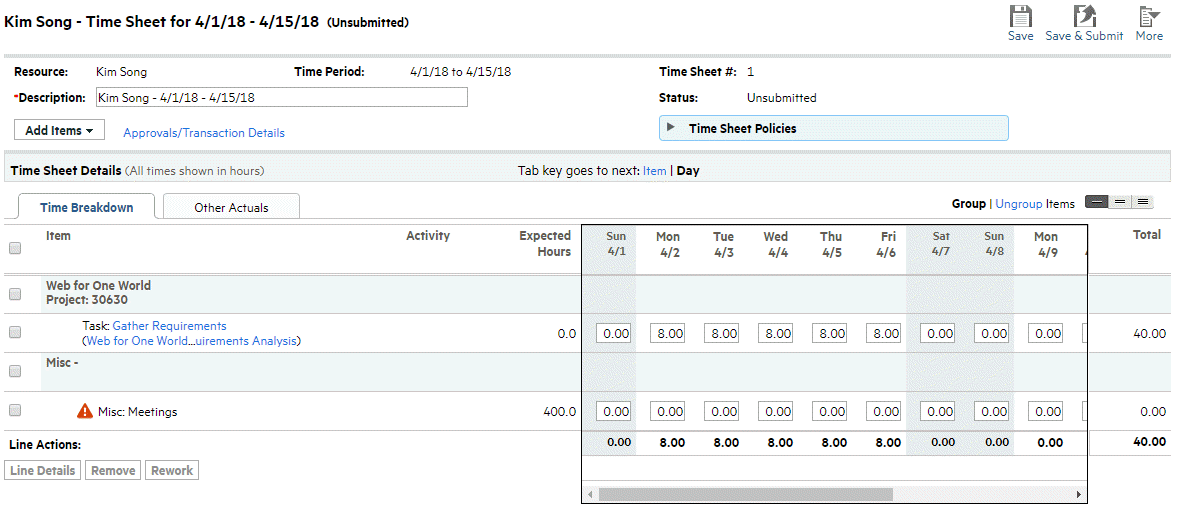 You use the time sheet Time Breakdown tab to specify how long you worked on each work item.
