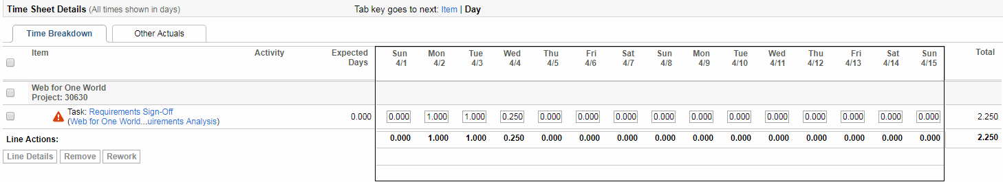 Enter the number of hours you worked on the work item each day. The total column displays line totals in hours. And the total row displays daily totals in hours. |