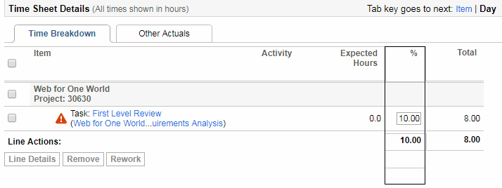Enter the percentage of the entire time period you worked on the work item. The time sheet policy can configure Time Management to calculate the total number of hours over the entire time period in either of the following ways: