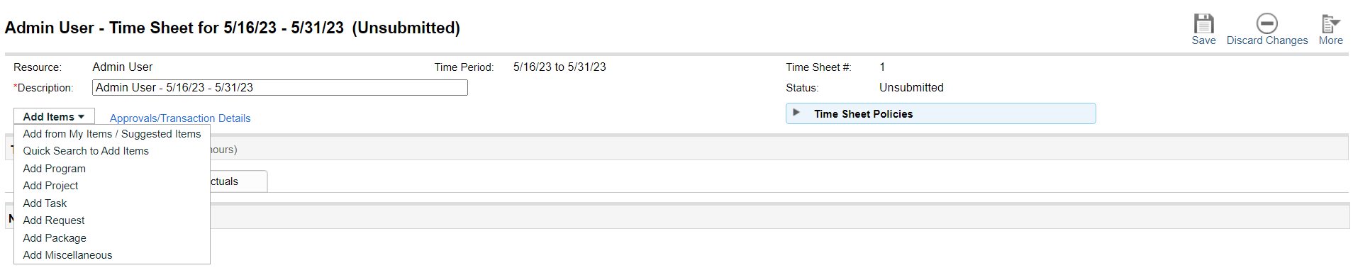 Add Miscellaneous Available only when the time sheet policy allows logging time against miscellaneous items.